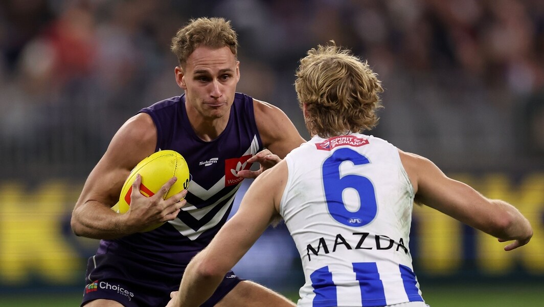 Will Brodie in action during Fremantle’s clash with North Melbourne in round eight, 2022. Picture: AFL Photos