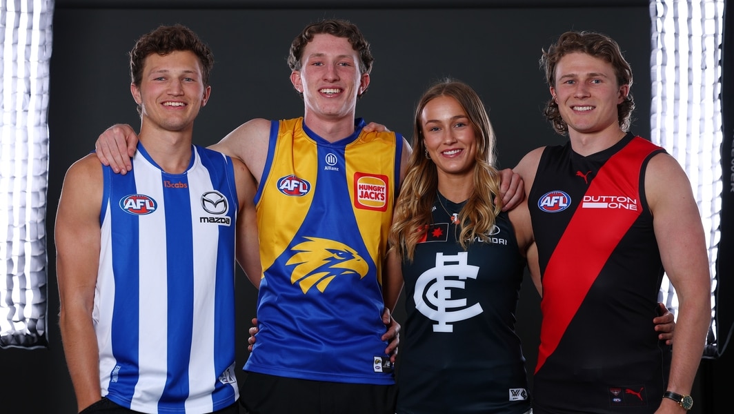 Zane, Willem, Yasmin and Xavier Duursma in their club colours at the 2025 Telstra AFL Draft. Picture: AFL Photos