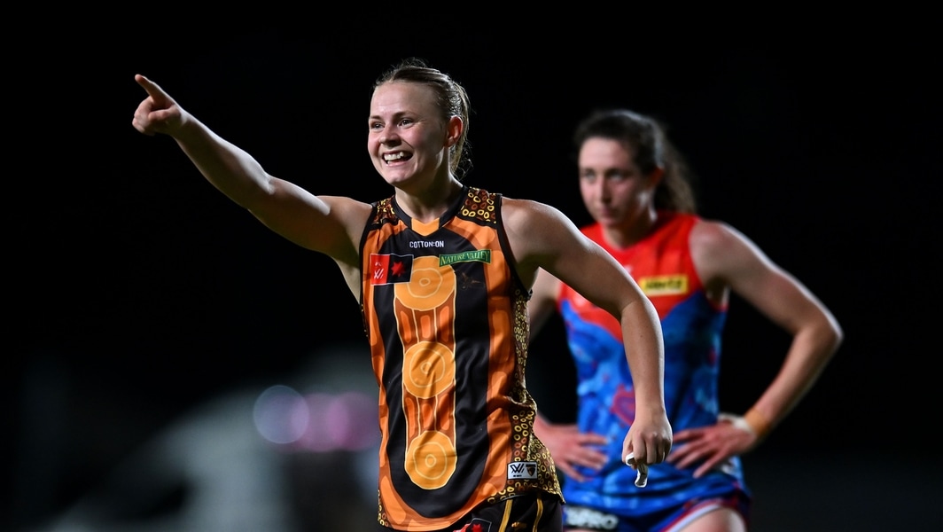 Ainslie Kemp celebrates Hawthorn’s victory over Melbourne at Cazaly’s Stadium in week nine, 2024. Picture: AFL Photos