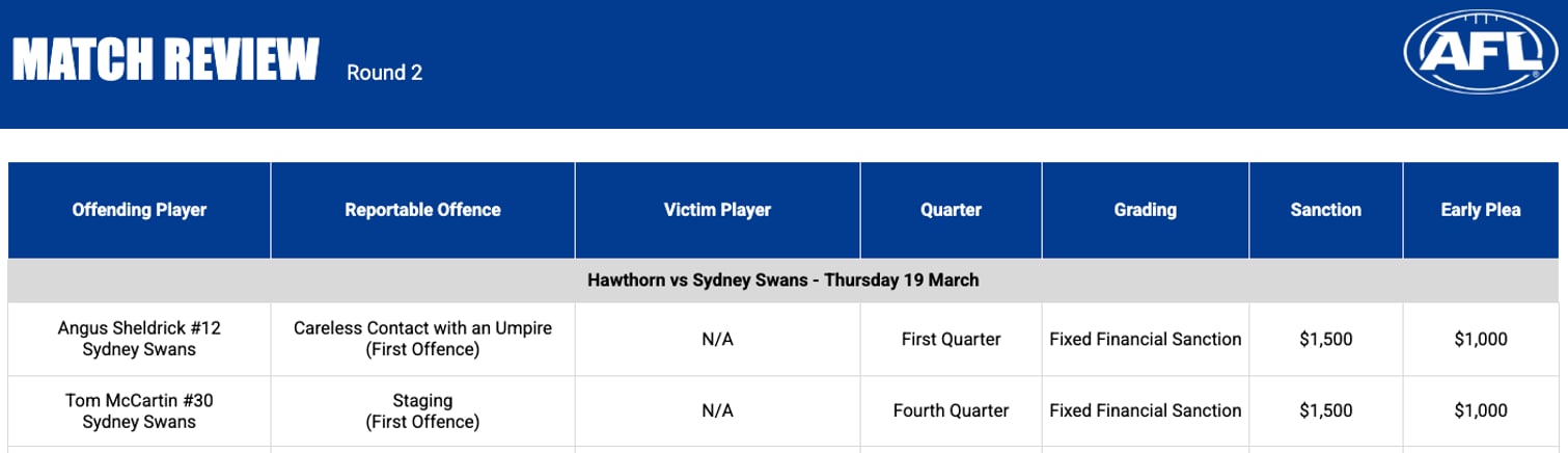 The AFL advises the Match Review for Thursday’s Round 2 match has been completed.