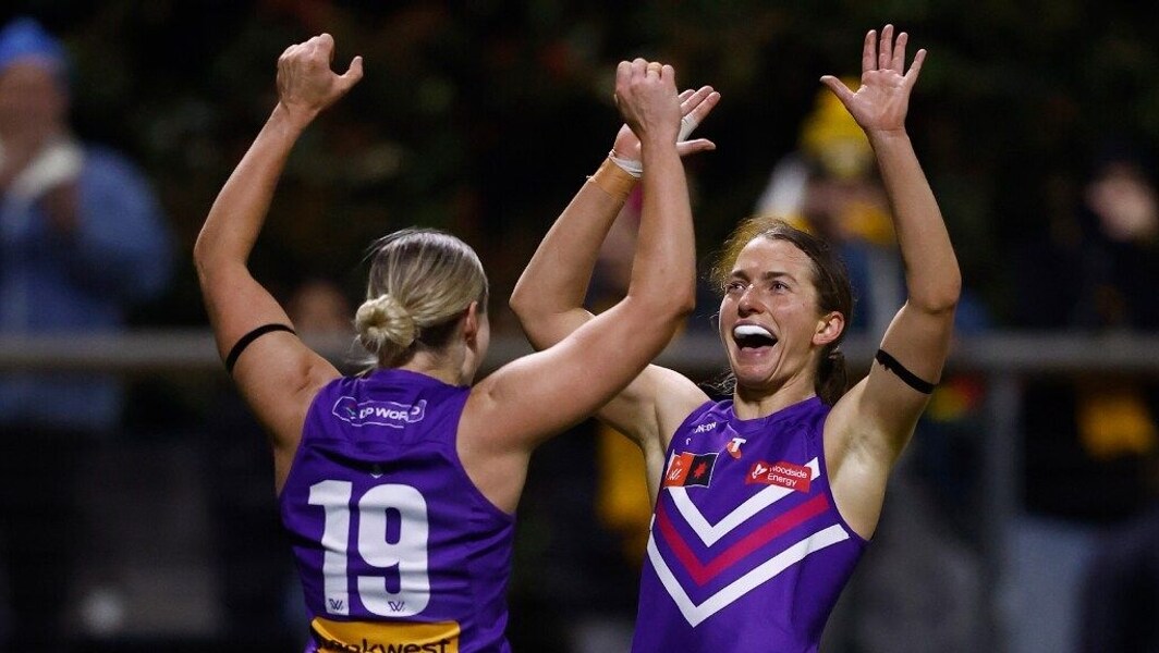Wales was awarded a holding the ball free kick deep inside Fremantle’s 50 and tried to take on the Dockers’ ruck, only to be run down. Strom then handballed to former skipper Hayley Miller who converted into the howling breeze.