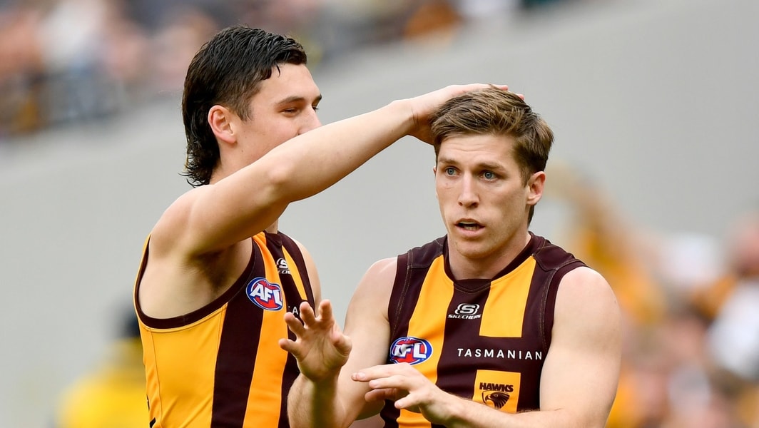 Dylan Moore (right) is congratulated by Connor Macdonald after kicking a goal during the match between Hawthorn and Richmond at the MCG in round 23, 2024. Picture: AFL Photos