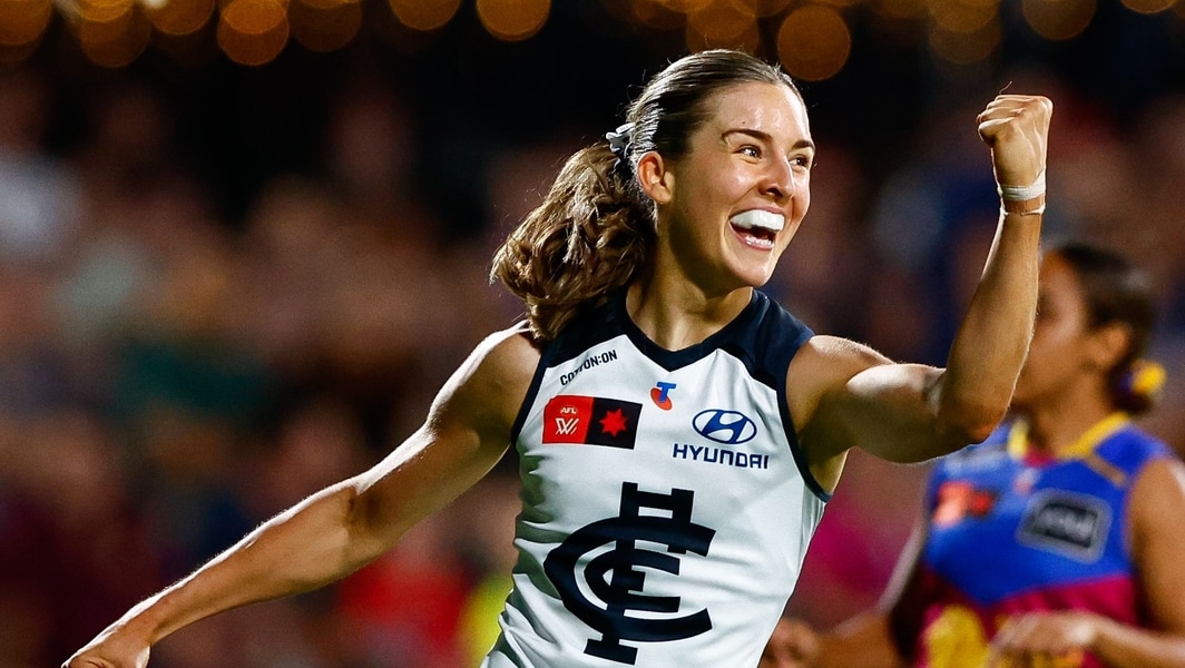 Dayna Finn celebrates a goal during the preliminary final between Brisbane and Carlton at Brighton Homes Arena on November 22, 2025. Picture: AFL Photos