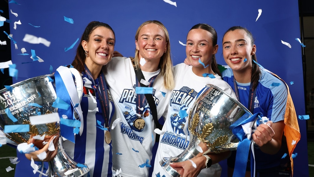 Erika O’Shea, Vikki Wall, Amy Gavin Mangan and Blaithin Bogue pose for a photo after North Melbourne’s 2025 Grand Final win over Brisbane at Ikon Park. Picture: AFL Photos