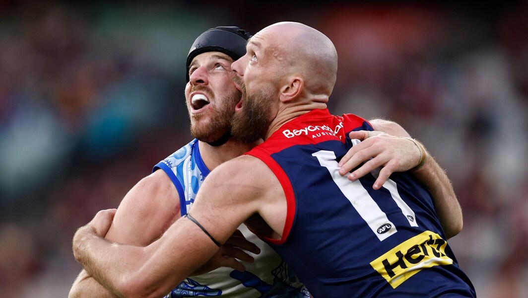 Tristan Xerri and Max Gawn compete in a ruck contest during the match between Melbourne and North Melbourne at the MCG in round 18, 2025. Picture: AFL Photos
