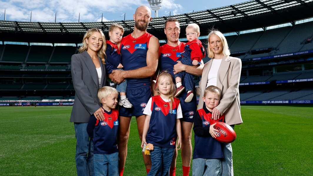 Max Gawn and wife Jess with children Louis and George are seen with Tom McDonald and wife Ruby with children Hildie, Leo and Bella at the MCG on March 26, 2026 ahead of Max and Tom’s 250th matches. Pictures: AFL Photos