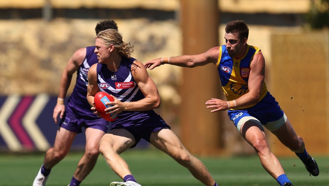 Hayden Young in action during the Match Simulation game between Fremantle and West Coast at Victor George Kailis Oval, on February 21, 2026. Picture: AFL Photos