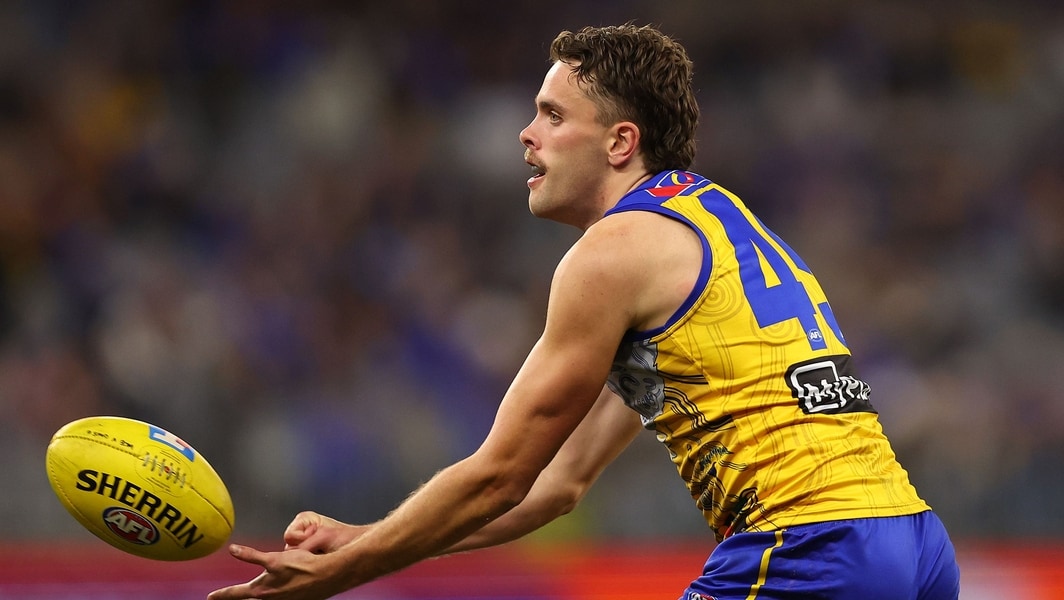 Tom McCarthy handballs during West Coast’s clash against Greater Western Sydney in round 17, 2025. Picture: Getty Images