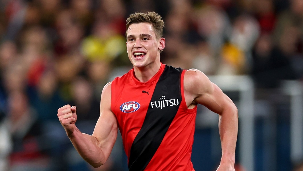 Archie May celebrates a goal during Essendon’s clash against Richmond in round 18, 2025. Picture: AFL Photos