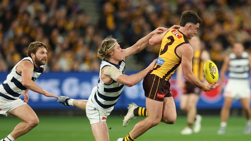 Jai Newcombe is tackled by Mark Blicavs in the 2025 preliminary final between Geelong and Hawthorn. Pictures: AFL Photos