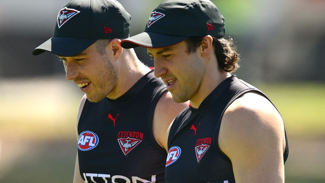 Zach Merrett and Andrew McGrath at Essendon training, February 2026. Picture: AFL Photos