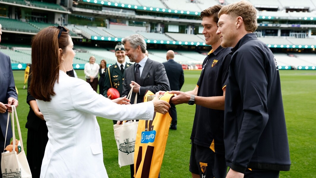Queen Mary of Denmark receives a Hawthorn jumper from Hawks players Will Day and James Sicily at the MCG on Tuesday, March 17, 2026. Picture: Michael Willson, AFL Photos