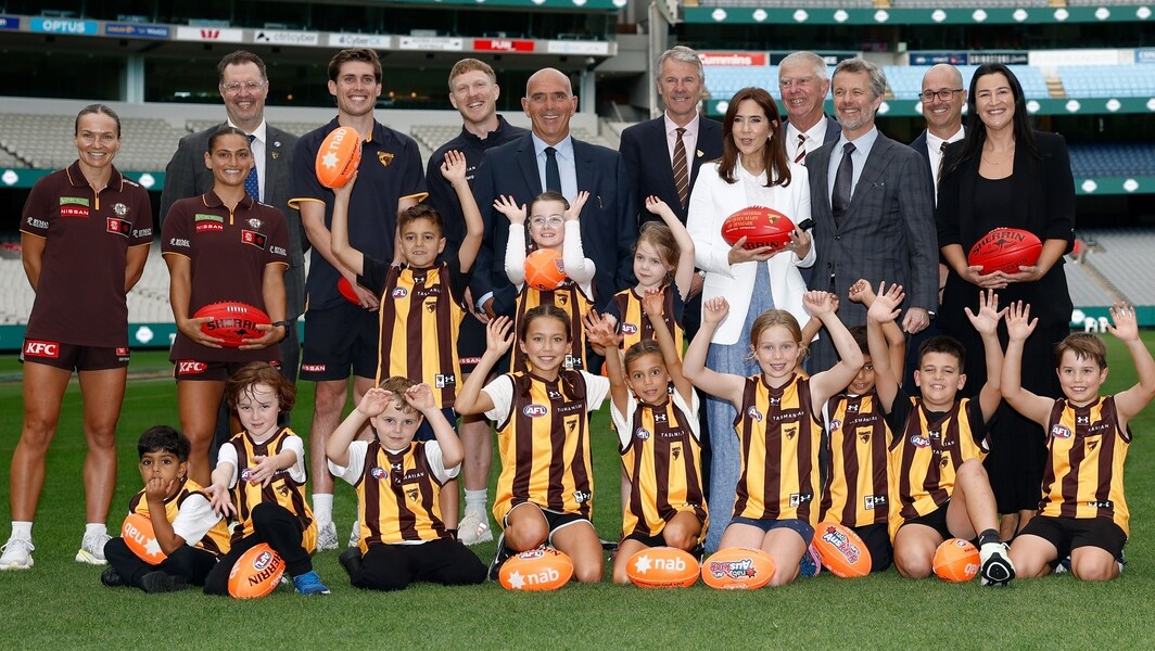 Emily Bates, Eliza West, Australian ambassador to Denmark Dave Rosen, Will Day, James Sicily, MCC CEO Stuart Fox, Hawks president Andy Gowers, Queen Mary of Denmark, MCC president Fred Oldfield, King Frederik X of Denmark, Hawks CEO Ash Klein, AFL EGM football operations Laura Kane and junior footballers at the MCG on March 17, 2026. Picture: Michael Willson, AFL Photos