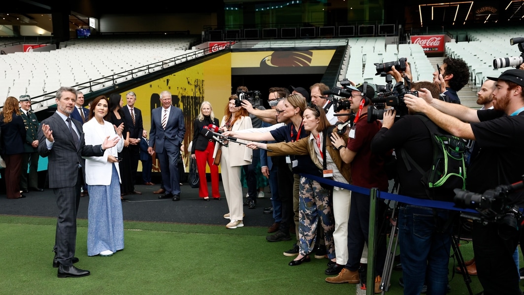 King Frederik and Queen Mary field questions from reporters at the MCG on Tuesday, March 17, 2026. Picture: AFL Photos