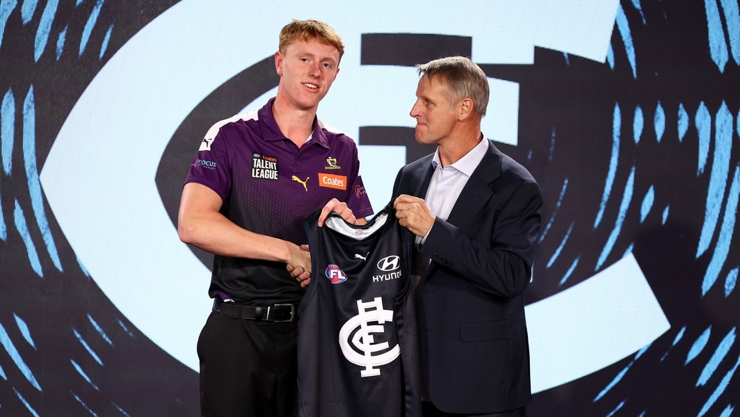 Peter Dean presents his son Harry with his Carlton guernsey at the 2025 Telstra AFL Draft. Picture: AFL Photos