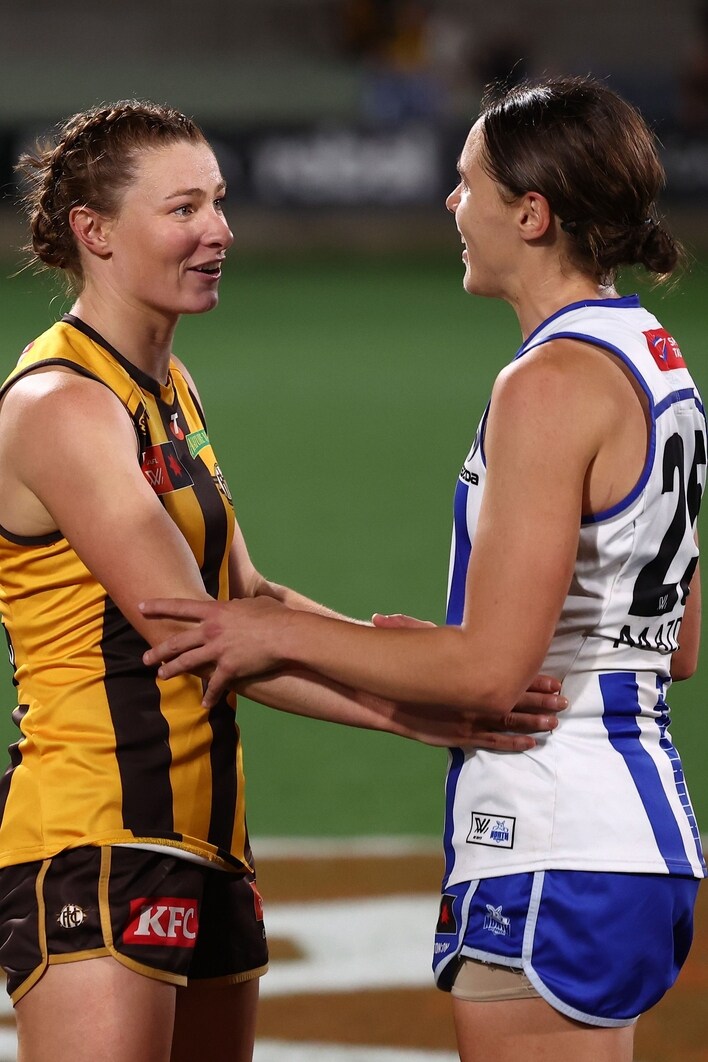Aileen Gilroy (left) and Jasmine Garner chat after the qualifying final between North Melbourne and Hawthorn on November 7, 2025. Picture: AFL Photos