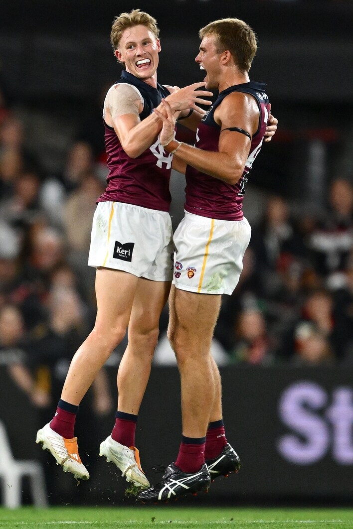 Jaspa Fletcher (left) and Ty Gallop celebrate a goal during round three, 2026. Picture: AFL Photos/Getty Images