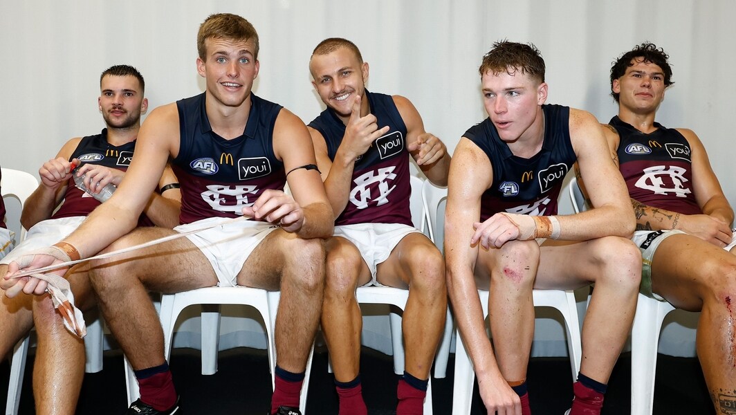 L-R: Darcy Wilmot, Ty Gallop, Kai Lohmann, Logan Morris and Cam Rayner celebrate a win during round three, 2026. Picture: AFL Photos