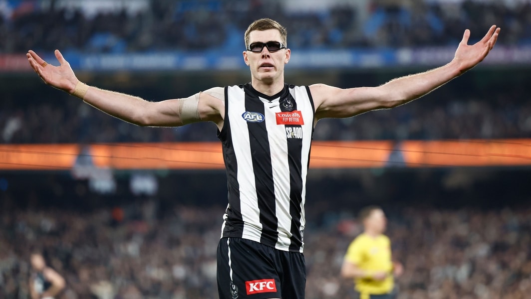 Mason Cox celebrates a goal during the Round 21 match between Collingwood and Carlton at The Melbourne Cricket Ground on August 3, 2024. Picture: AFL Photos