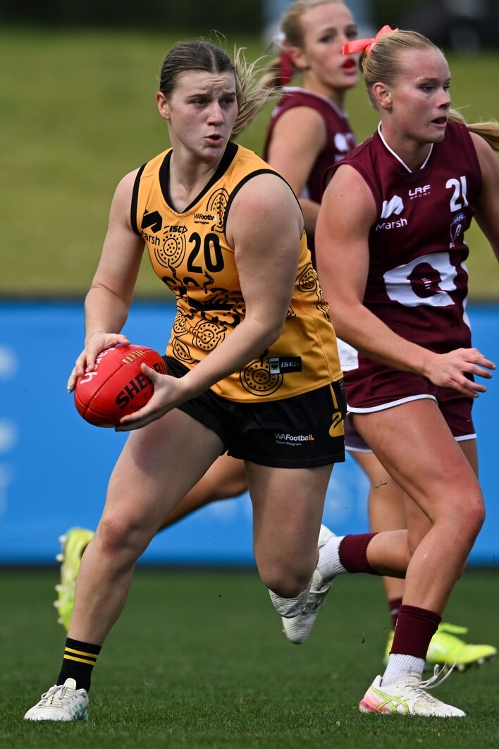 Carys Daddario in action during the 2025 Marsh AFL National Development Championships match between Western Australia and Queensland at RSEA Park. Picture: AFL Photos
