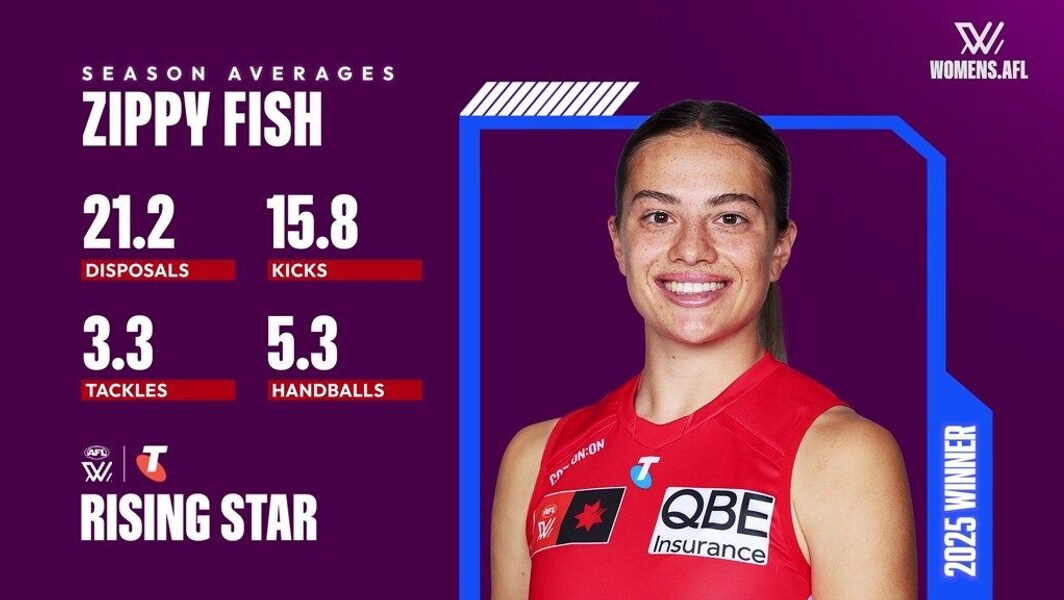 SYDNEY young gun Zippy Fish has capped off a brilliant debut season by being named the 2025 Telstra AFLW Rising Star.