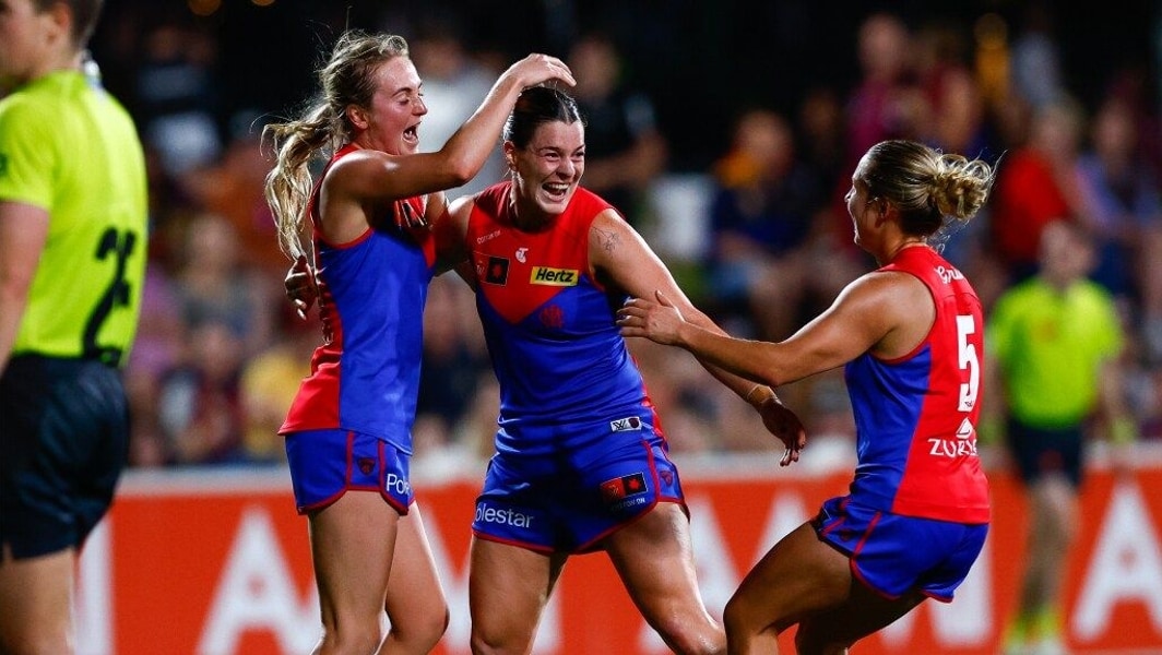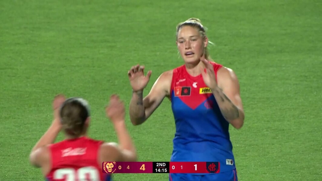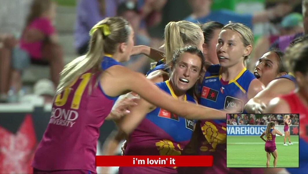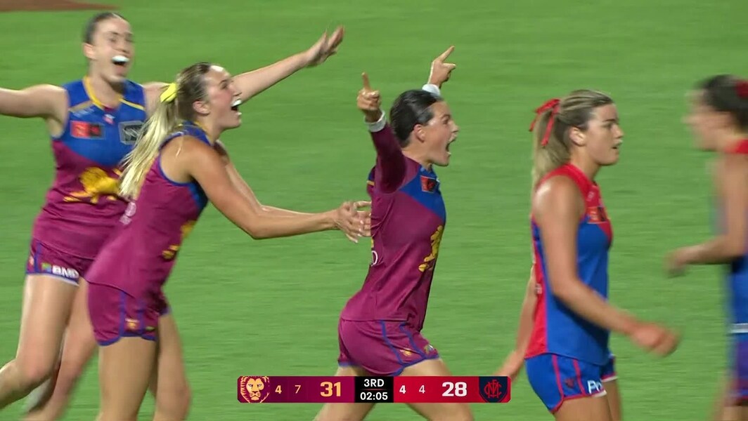 In her 43rd career game, Melbourne defender Maeve Chaplin kicked her first goal – and what a time to do it. With Brisbane dominating the third quarter and kicking four unanswered goals, Chaplin found space inside 50 and took a mark from a Tayla Harris pass one second before the three-quarter-time siren sounded. From 30m out, she calmly went back and slotted the goal to reduce the margin to three points and was promptly mobbed by her excited teammates.