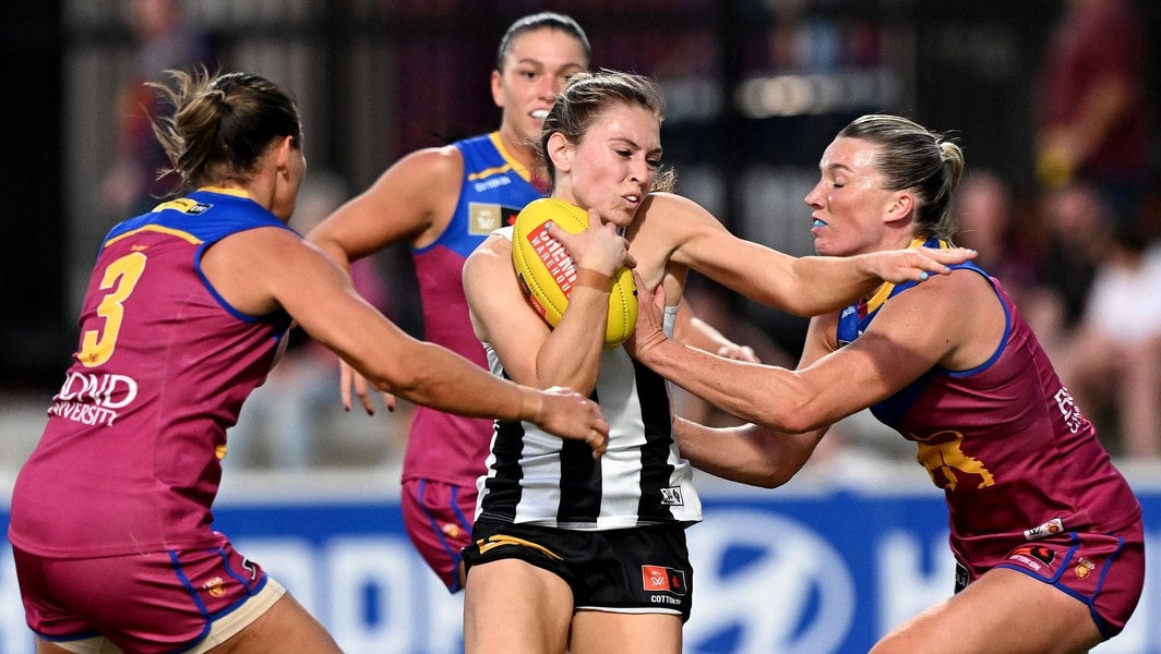 Alana Porter is tackled by Lions players during Collingwood’s clash with Brisbane in AFLW round three, 2024. Picture: AFL Photos