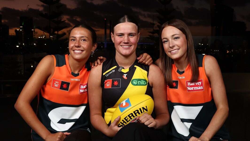 Top three picks (L-R) Kiera Yerbury (No.3), Olivia Wolmarans (No.1) and Scarlett Johnson (No.2) after the 2025 Telstra AFLW Draft at Marvel Stadium. Picture: AFL Photos