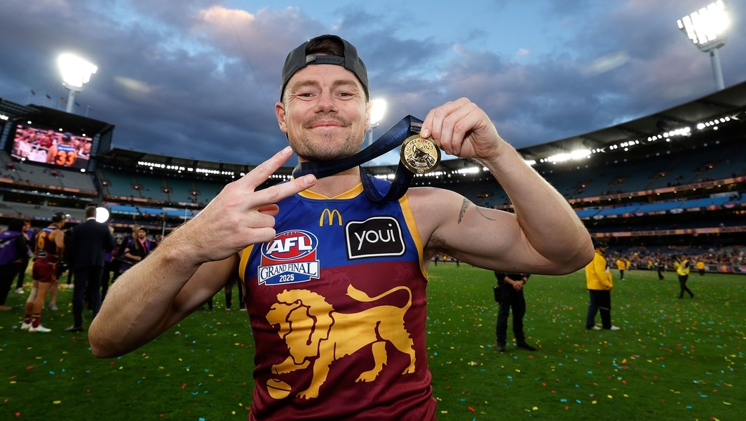Lachie Neale celebrates with his medal after Brisbane’s Toyota AFL Grand Final win over Geelong on September 27, 2025. Picture: Getty Images
