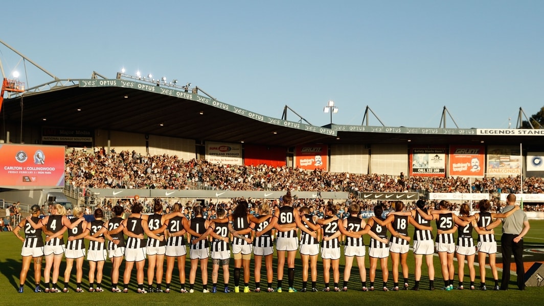 Collingwood players line up ahead of the opening NAB AFL Women’s game against Carlton at Ikon Park in 2017. Picture: AFL Photos