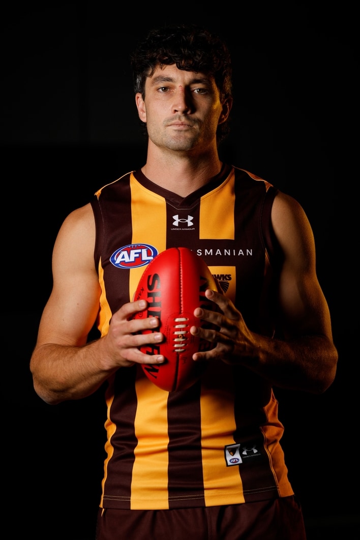 Tom Barrass poses during Hawthorn’s 2026 team photo day at the Kennedy Community Centre. Picture: AFL Photos