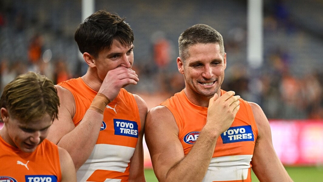 Sam Taylor and Jesse Hogan after the round two match between West Coast and Greater Western Sydney at Optus Stadium, March 24, 2024. Picture: AFL Photos