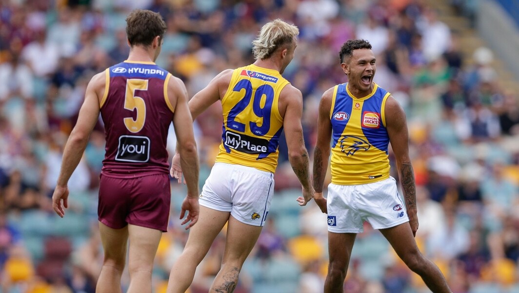 Tyrell Dewar celebrates during the round two match between Brisbane and West Coast at The Gabba, March 23, 2025. Picture: AFL Photos