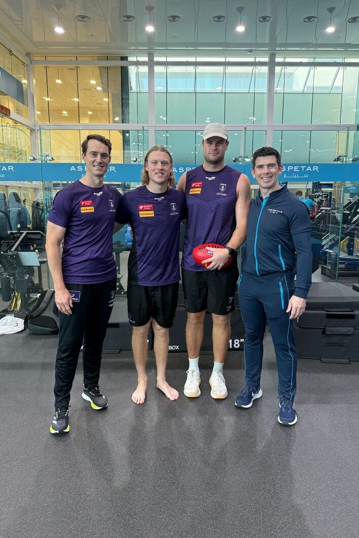 Fremantle physiotherapist and rehabilitation manager James Grierson, Hayden Young, Sean Darcy and Dr Enda King at rehabilitation clinic Aspetar in Doha. Picture: Fremantle FC