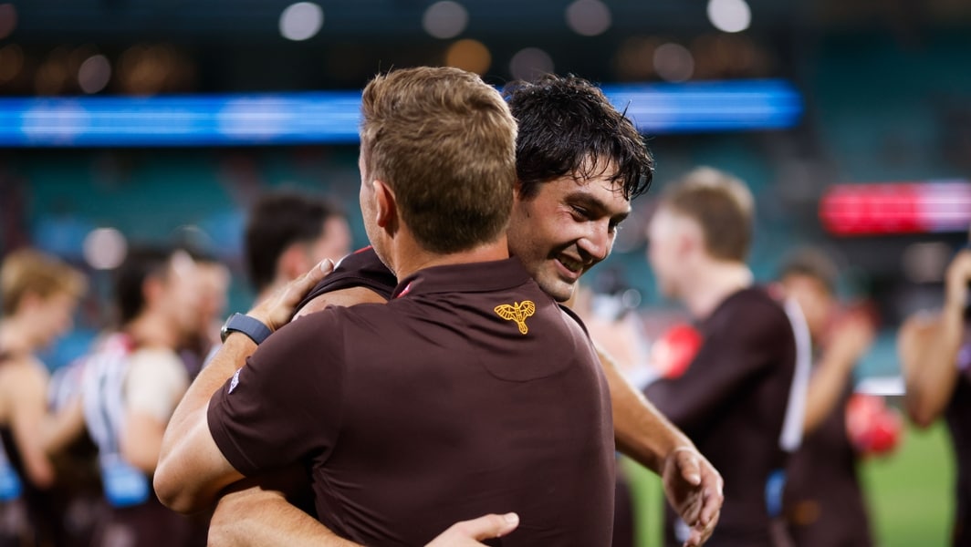 Sam Mitchell hugs Tom Barrass after Hawthorn’s win over Sydney at the SCG in Opening Round, 2025. Picture: AFL Photos