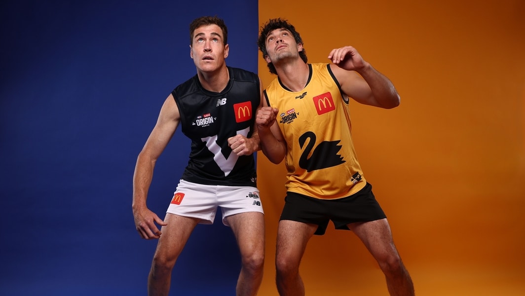 Victoria’s Jeremy Cameron and Western Australia’s Tom Barrass ahead of 2026 AAMI AFL Origin. Picture: AFL Photos