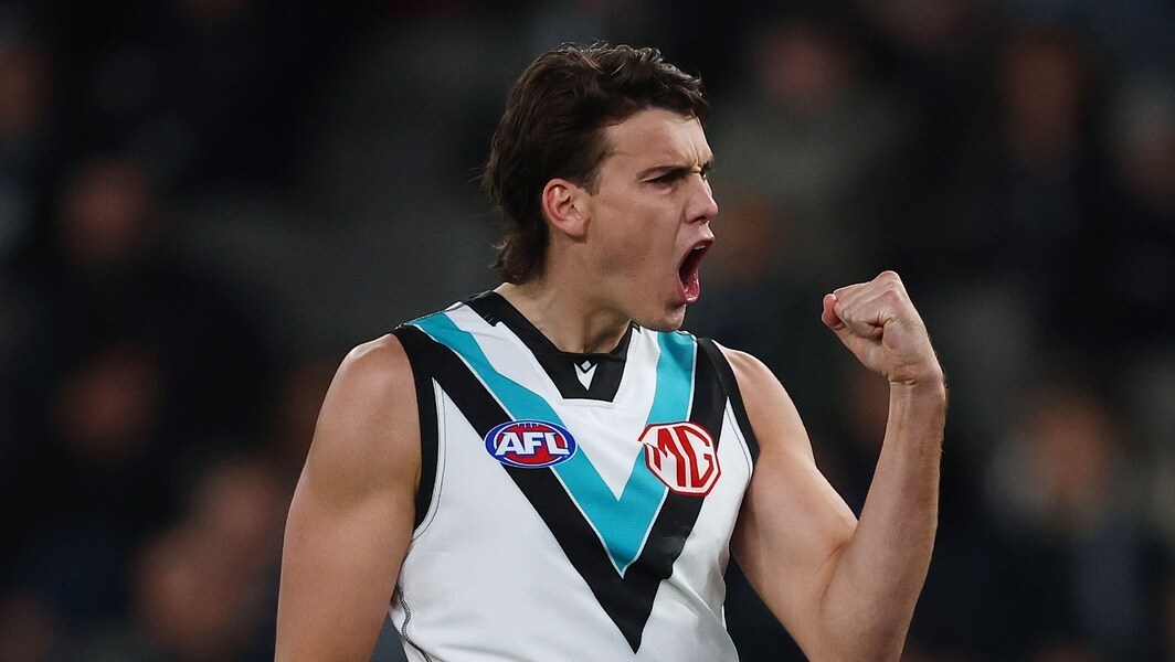 Ollie Lord celebrates a goal during the round 23 match between Port Adelaide and Carlton at Marvel Stadium on August 16, 2025. Picture: Getty Images/AFL Photos