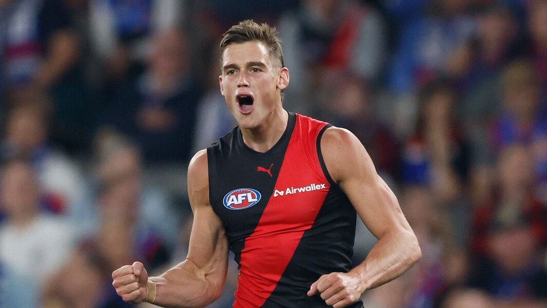 Archie May celebrates a goal during the R4 match between Essendon and the Western Bulldogs at Marvel Stadium on April 5, 2026. Picture: AFL Photos