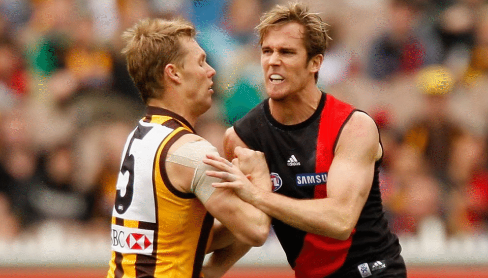 Sam Mitchell and Andrew Welsh during the match between Hawthorn and Essendon in 2009. Picture: AFL Photos
