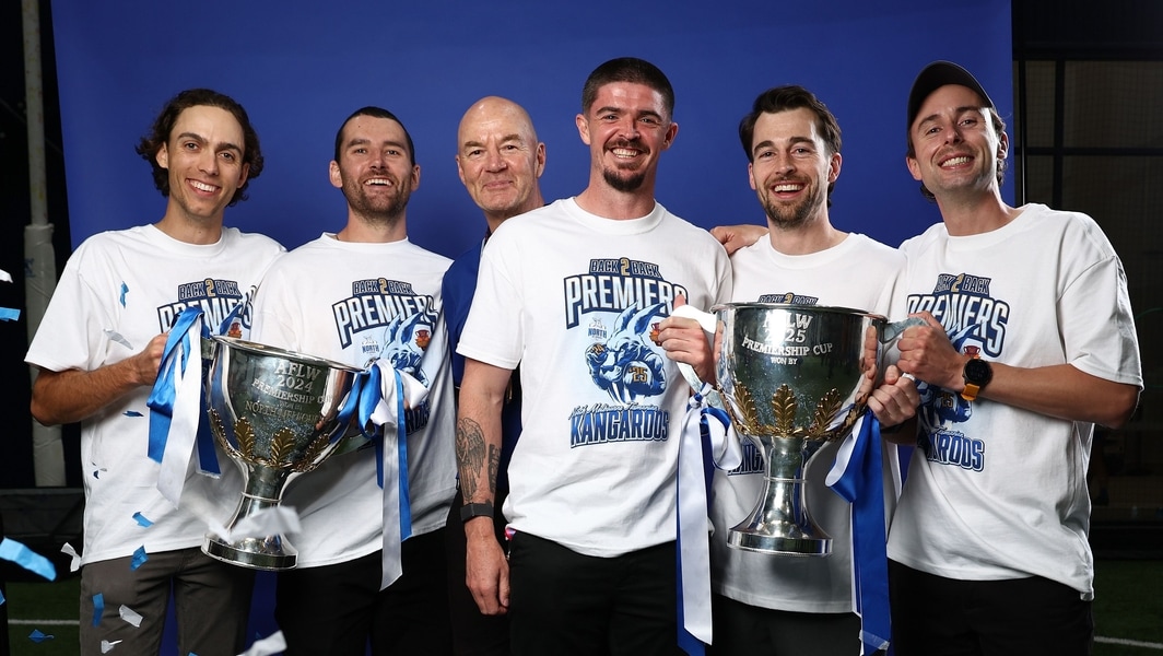 Ryan Pendlebury (C) with coach Darren Crocker and other members of North Melbourne’s coaching team after the 2025 AFLW Grand Final against Brisbane at Ikon Park on November 29, 2025. Picture: AFL Photos
