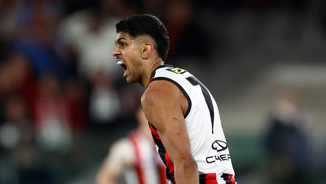Nasiah Wanganeen-Milera celebrates a goal during St Kilda’s clash against Essendon in round 23, 2025. Picture: AFL Photos