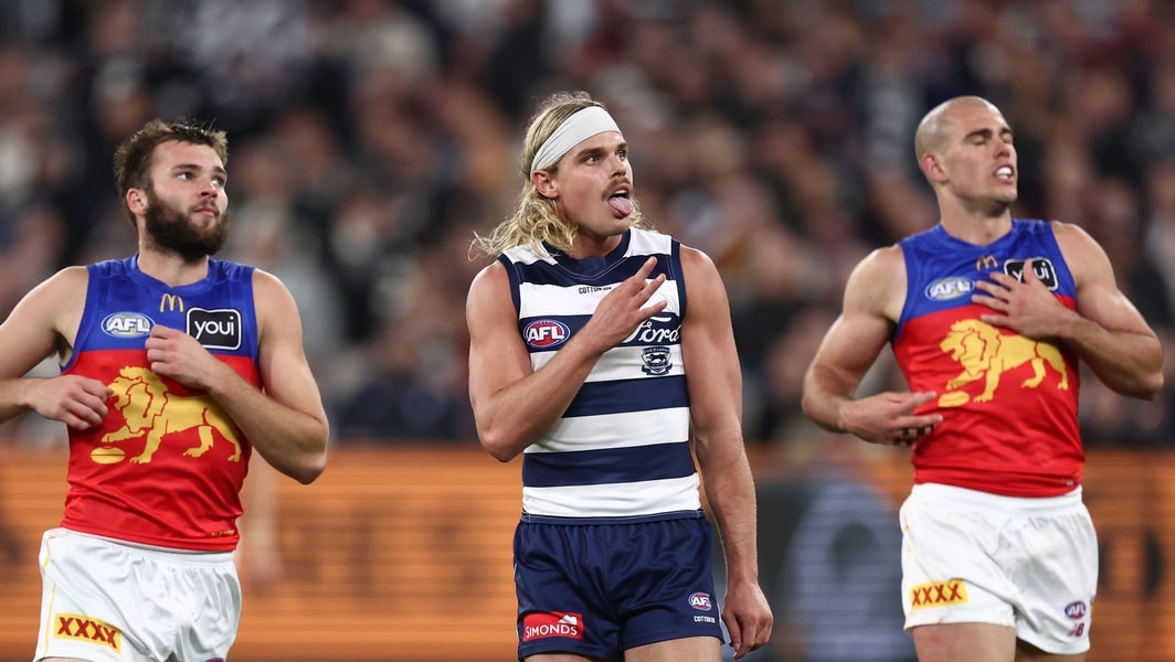 Bailey Smith celebrates a goal during Geelong’s win over Brisbane in the 2025 qualifying final. Picture: AFL Photos