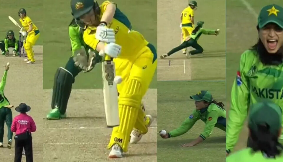 The young Pakistani bowler showed great athleticism by tumbling to her right and taking a sharp two-handed catch despite the non-striker’s close presence. This caught Australia on the back foot, with the visitors now struggling at 76 for 7, well into a batting collapse.