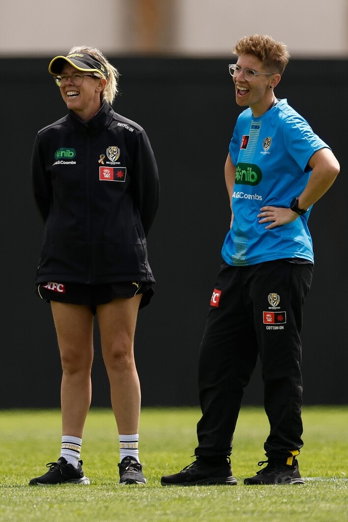 Kate Sheahan (left) and Emma Grant are seen during a Richmond training session on October 17, 2025. Picture: AFL Photos