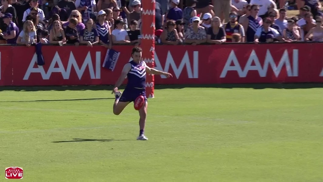 It was the Dockers’ turn to utilise the breeze in the second quarter and Jordan Clark launched a kick-in past the centre circle, with Hayden Young then delivering inside 50 to Jye Amiss for a rapid coast-to-coast goal.