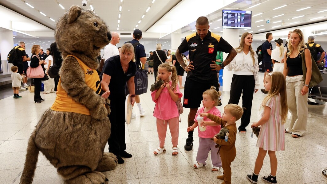 Fresh off the four-hour flight from Melbourne – which was delayed on the tarmac at least half an hour due to a grassfire in the vicinity of the airport – Barrass’ two young sons were particularly keen to meet the quokka mascot, which was donning a West Australian guernsey.