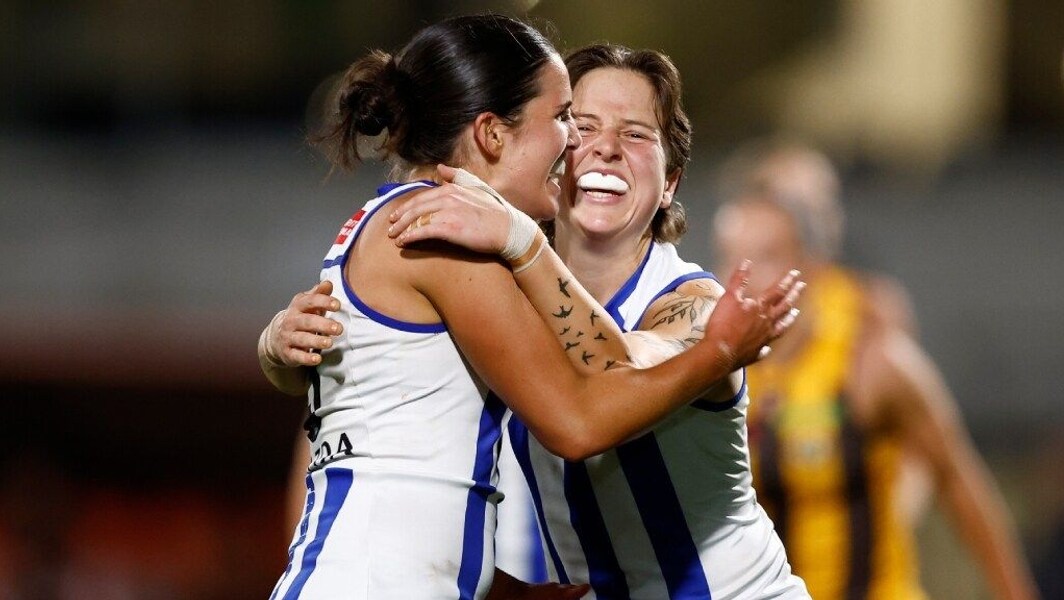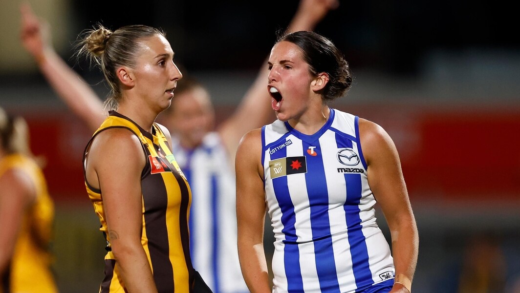 Bella Eddey celebrates during the AFLW Qualifying Final between North Melbourne and Hawthorn at Ikon Park, November 7, 2025. Picture: AFL Photos