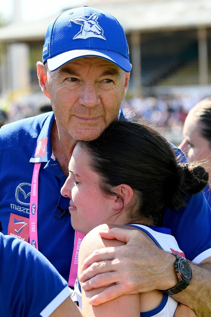 Bella Eddey and Darren Crocker after losing the AFLW Grand Final between North Melbourne and Brisbane at Ikon Park, December 3, 2023. Picture: AFL Photos