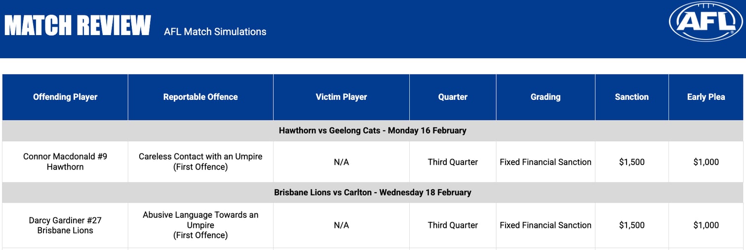 Meanwhile, Gardiner has been slapped with a $1000 fine (with an early guilty plea) for abusive language towards an umpire in the third quarter of the Lions’ match sim against Carlton.