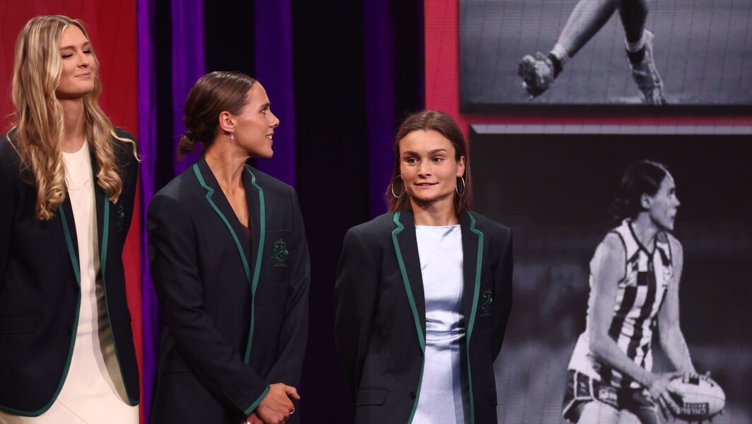 Mim Strom, Jasmine Garner and Ash Riddell after being named in the All-Australian team on November 24, 2025. Picture: AFL Photos